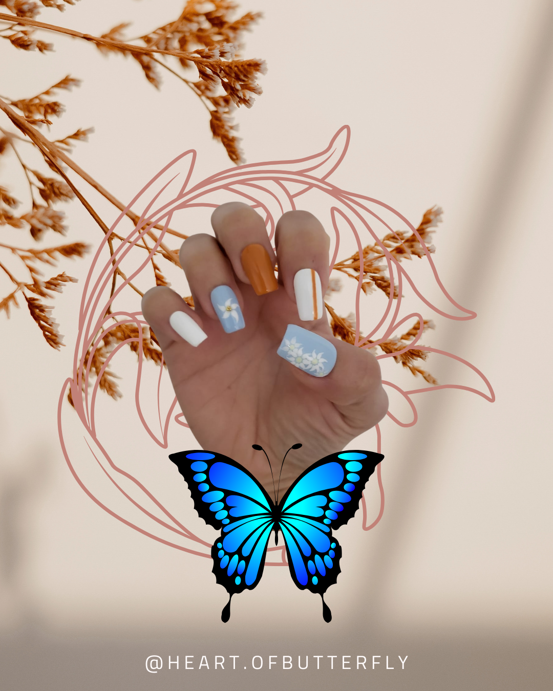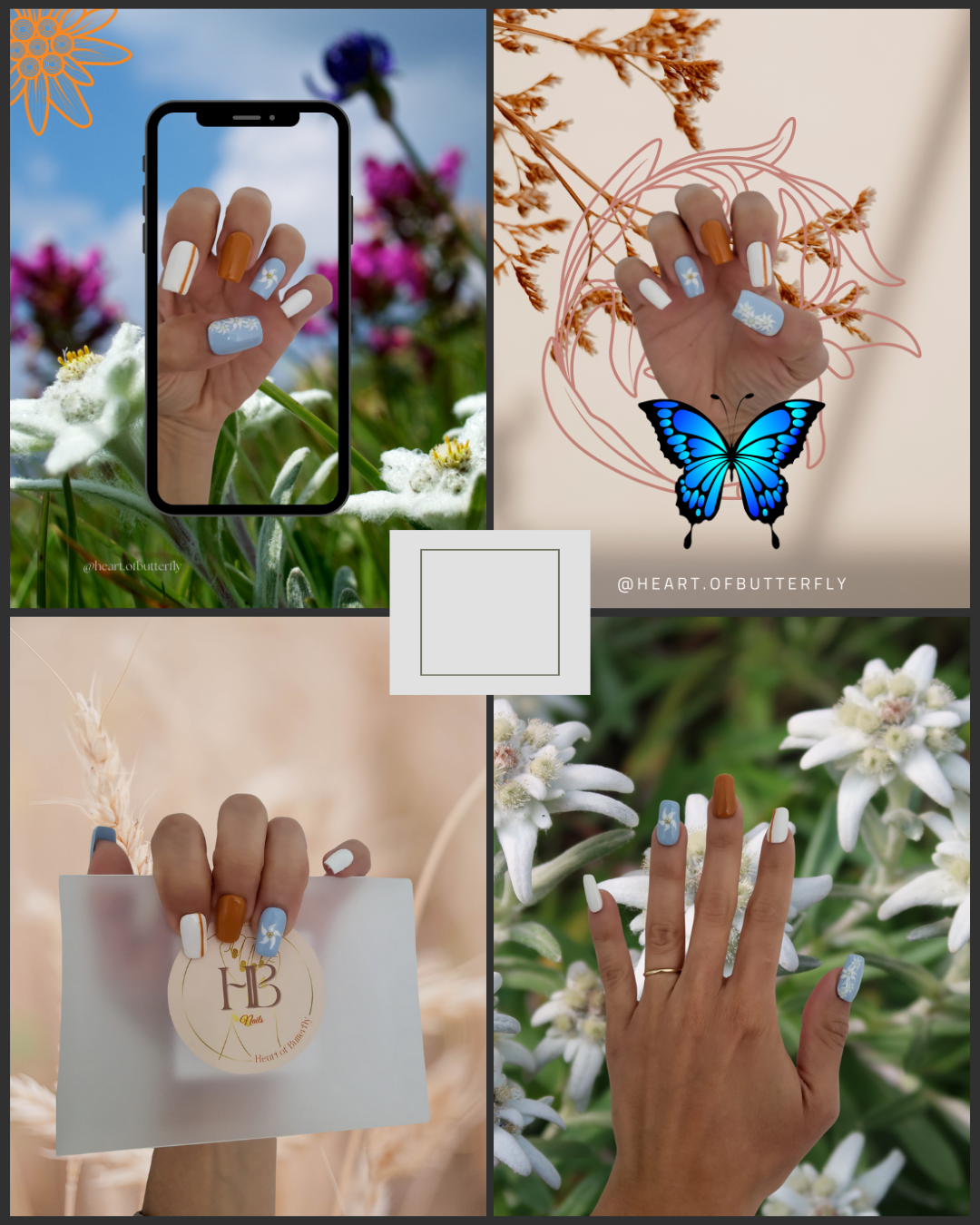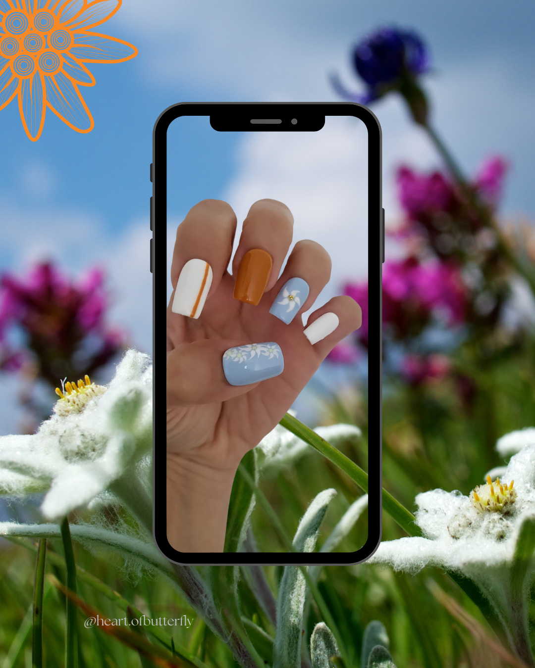 Pour accentuer cette impression d’harmonie et de contraste, j'ai choisi de trancher la douceur du bleu ciel de fond — rappelant la pureté et la fraîcheur des cimes alpines — avec un terracotta chaleureux sur un autre ongle. Ce dialogue entre le bleu apaisant et le terracotta vibrant évoque l'équilibre entre la force de la terre et la légèreté du ciel, une union parfaite pour mettre en valeur la délicatesse de l’Edelweiss. 🌿☀️